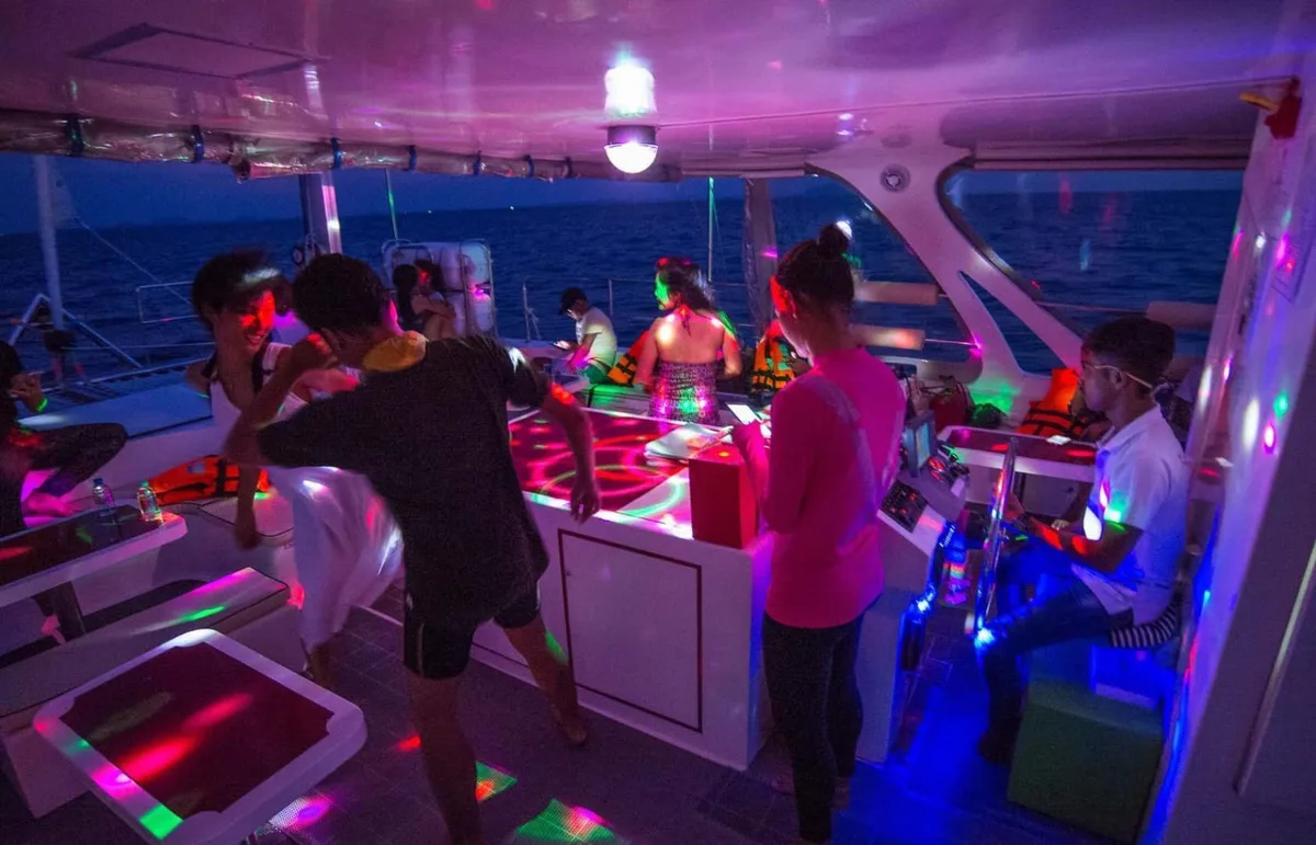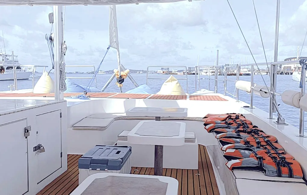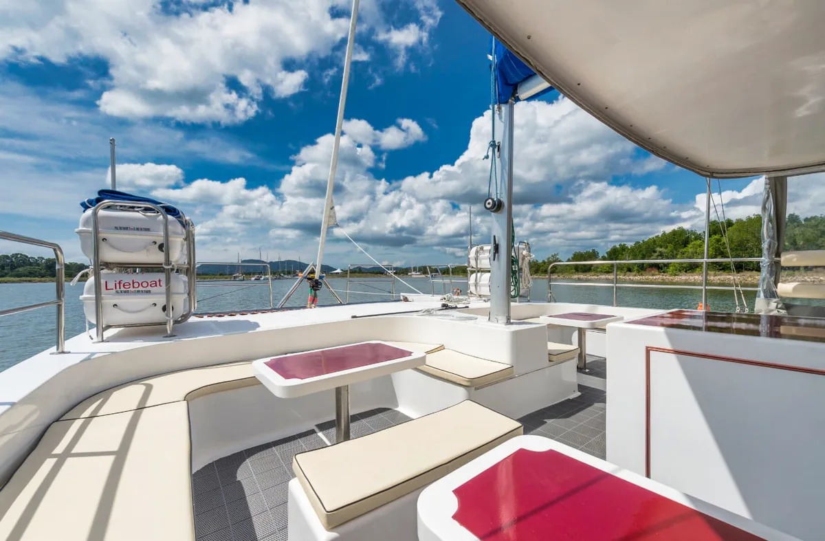Looking for a cheap, solid boat with no frills for a small big party with around 20 guests? Here it is: An open catamaran that offers the perfect platform for exuberant parties instead of luxury.