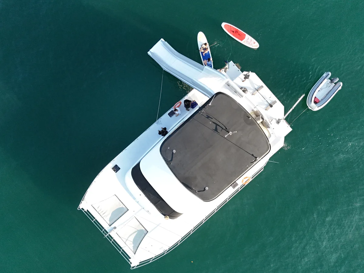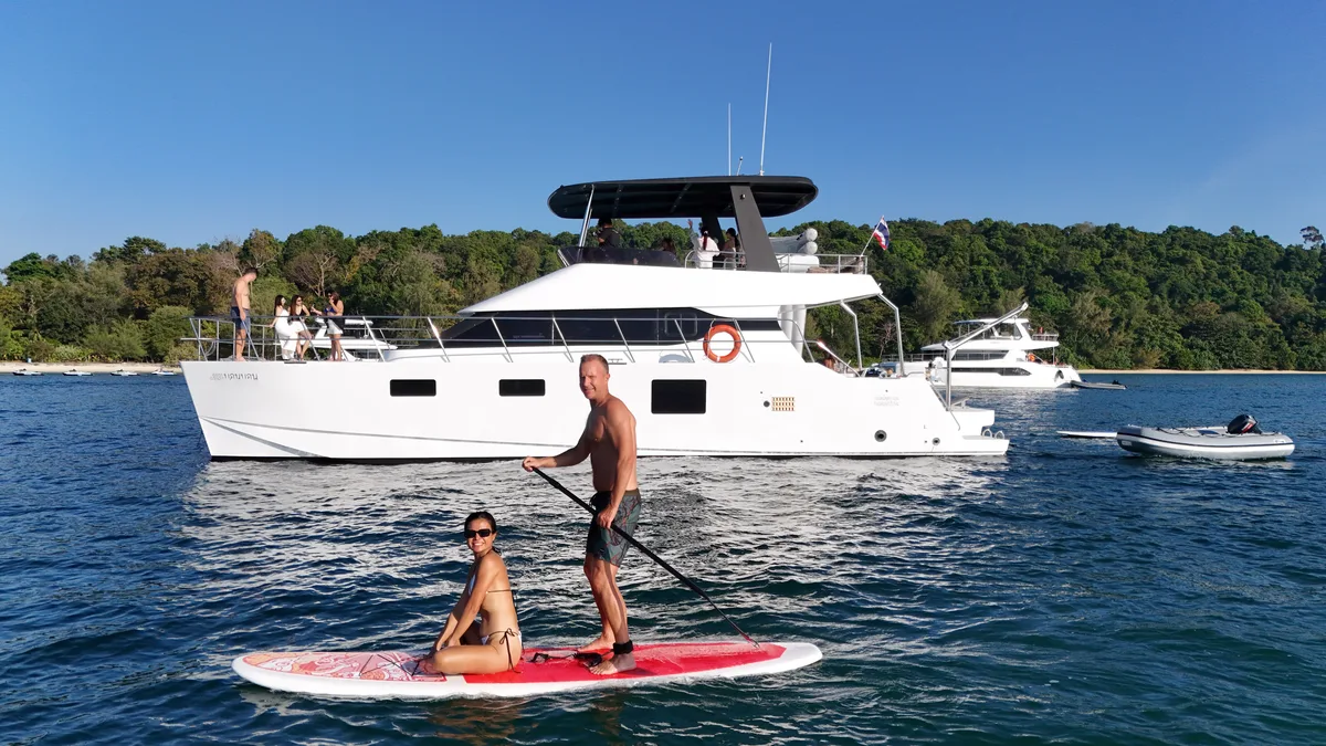 Features spacious flybridge, air-conditioned saloon, 3 cabins, waterslide, paddleboards, and snorkeling gear. Explore Phang Nga Bay's limestone cliffs, Koh Yao Yai's beaches, or Koh Hong Krabi's crystal waters.