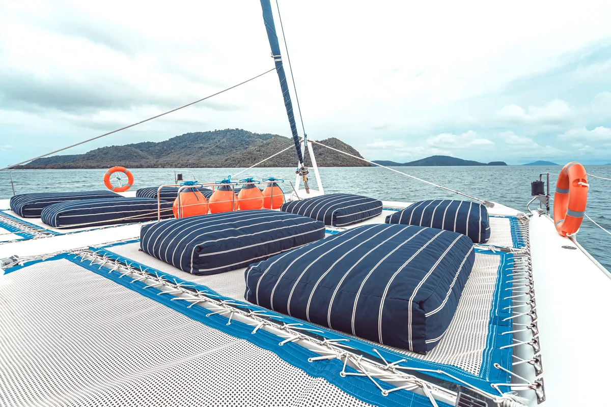 Joy has a galley and bar, and a nacelle with 10 settees (with 4 on each bench) and four dining tables. There are washrooms/changing rooms in each hull, and a chart table in the port hull.