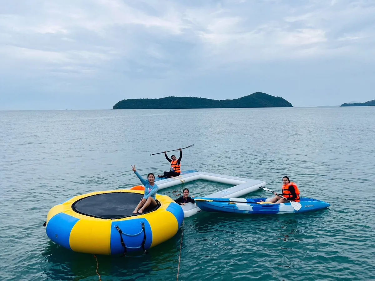 You will cruise with a speed of 7 knots on your trip to Maithon & Coral Island (8h) and be impressed by amenities like Bean bags, Flying Bridge, Freshwater Shower, Hot Water, Inflatable Pool, Multiple washrooms, Saloon, Sun-protected area / Awning, Trampoline as well as Fishing gear (on request), Kayak, Paddle board, Snorkeling masks.