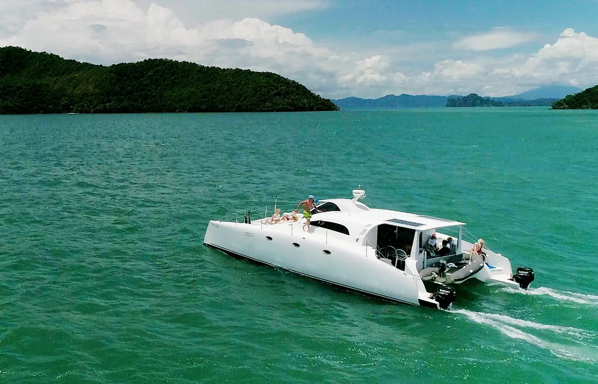 This fast catamaran takes you confidently in comfort and safety to the most beautiful places in the Andamen Sea, such as Phi Phi, Phang Nga Bay or Krabi.
