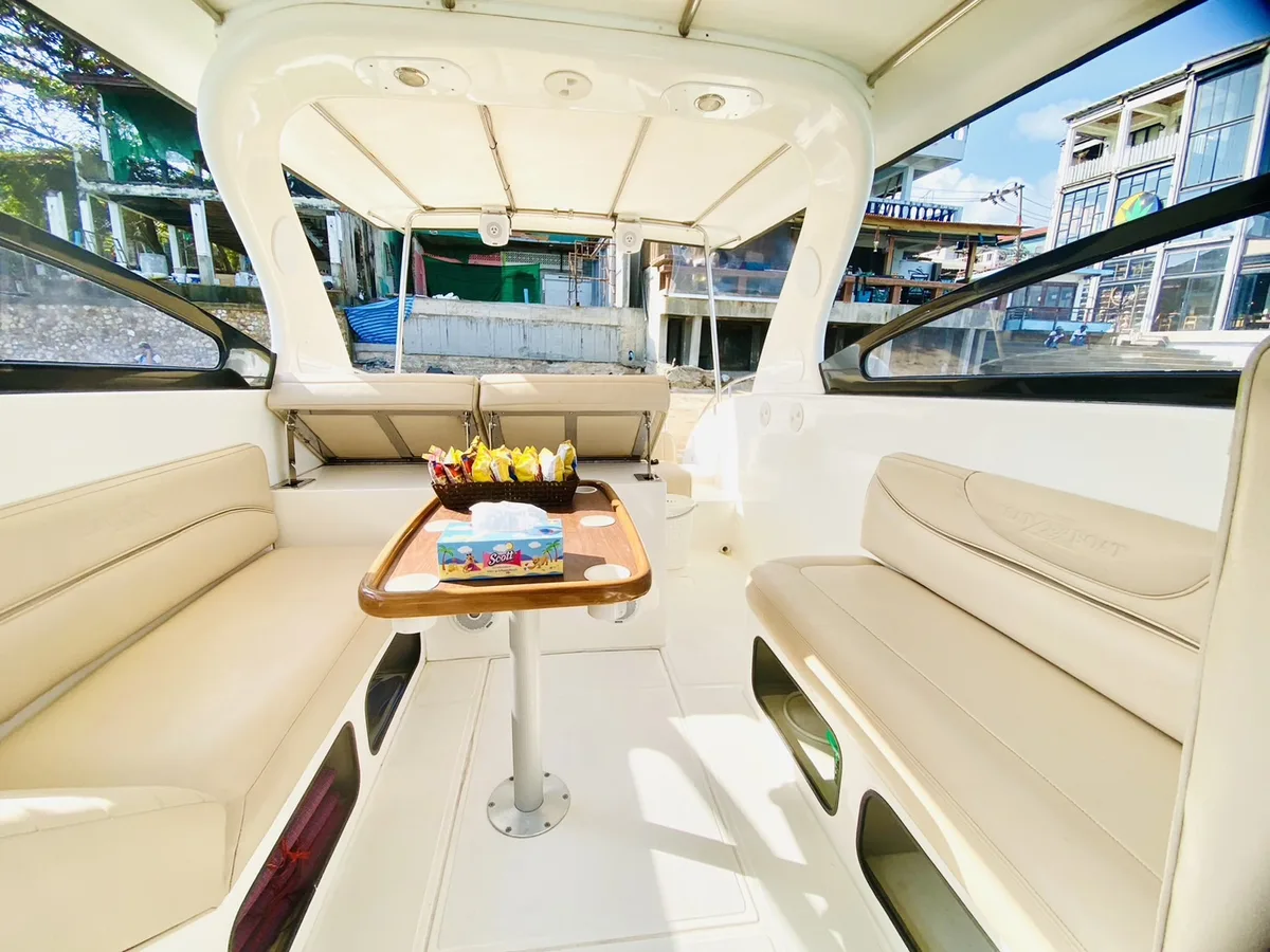 This comfortable 38ft Sports Cruiser for Charter in Samui is manufactured by Seat Boat, Thailand’s most established boat builder. She carries a maximum of 8 passengers and is perfect for a group of 6 with ample seating in the rear cabin along with a day bed and open seating area in the bow.