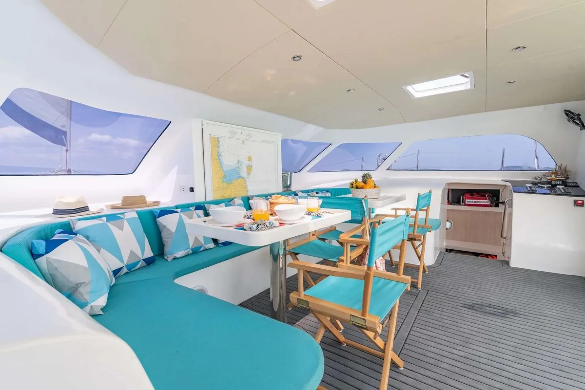 This luxury sailing Catamaran for Charter in Samui designed by the well-known UK-based boat designer and build in Thailand for tropical waters. With its spacious deck and salon, as well as a wide-decked platform at the stern its perfect for groups up to 18.