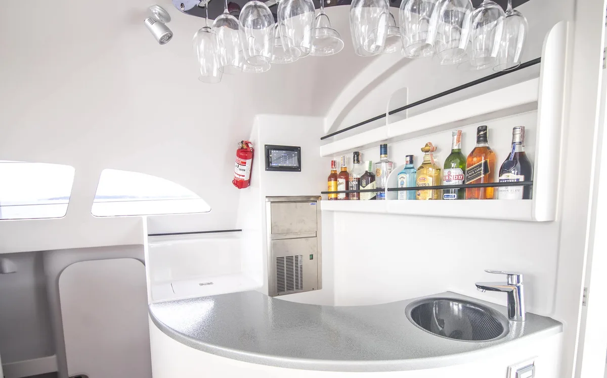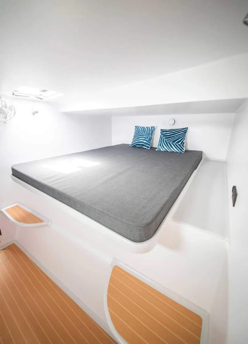 This speedster from Stealth is super light and accordingly fast with over 20 knots on the water to bring up to 24 guests to less visited islands.
