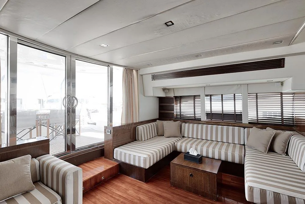 Elegance, refinement, comfort, and a taste for the pleasures of life: This stylish fly-bridge motor yacht offers up to 12 day guests grandiose tours with luxury and everything that makes a stay at sea unforgettable.