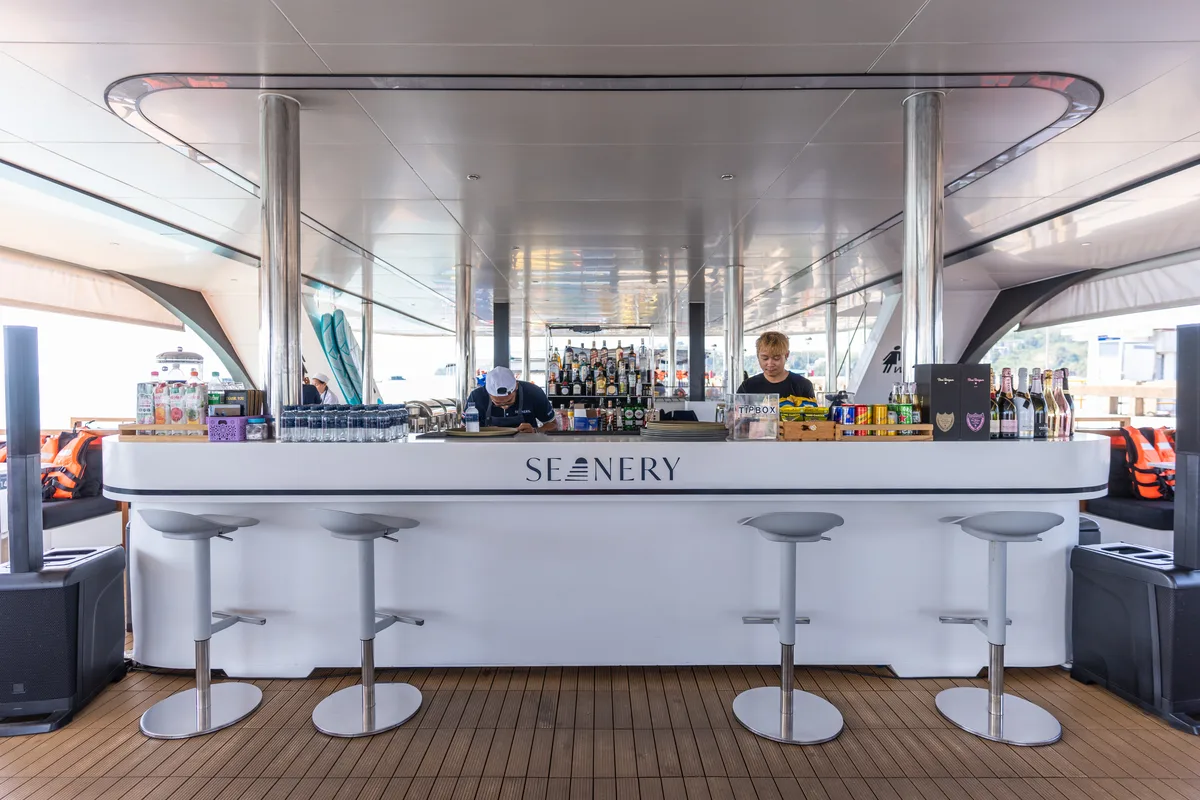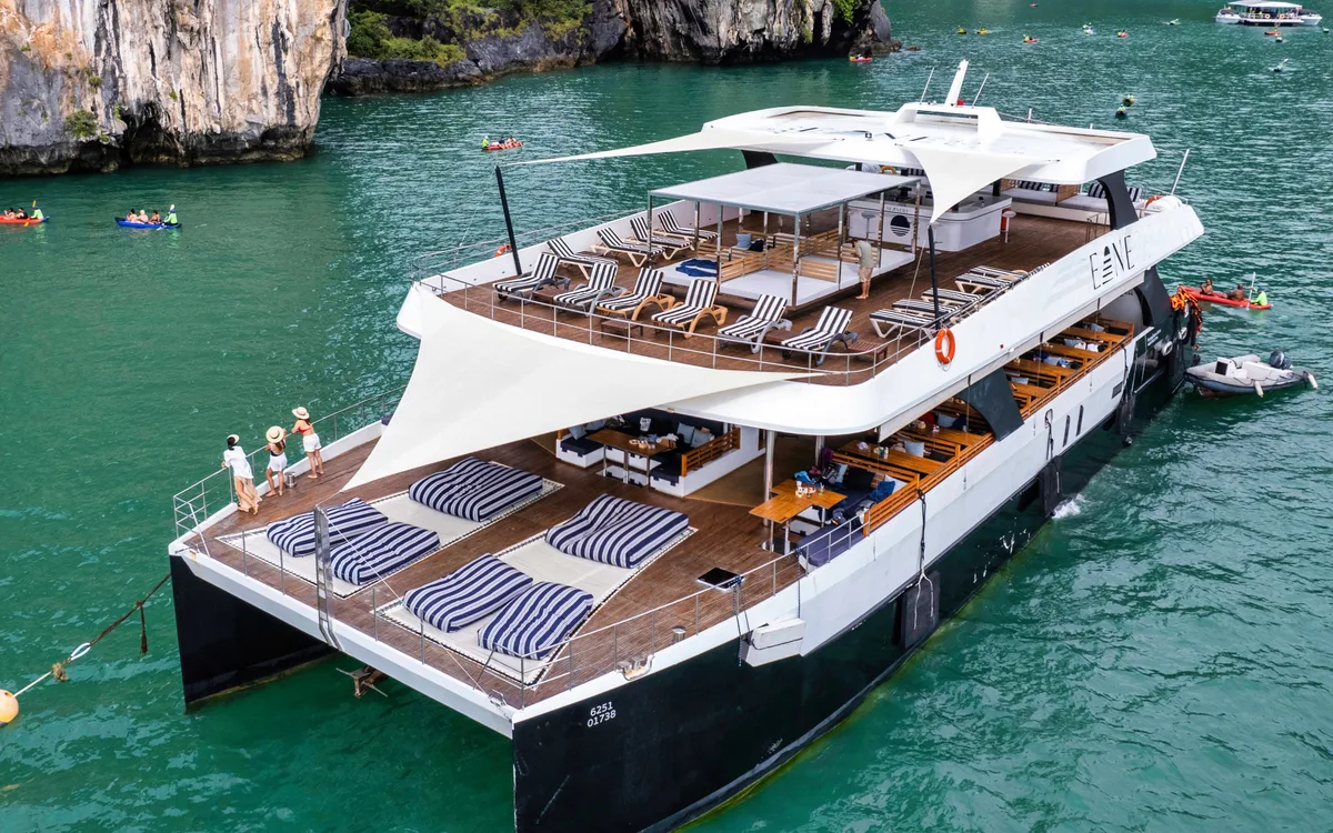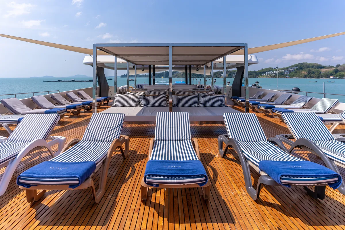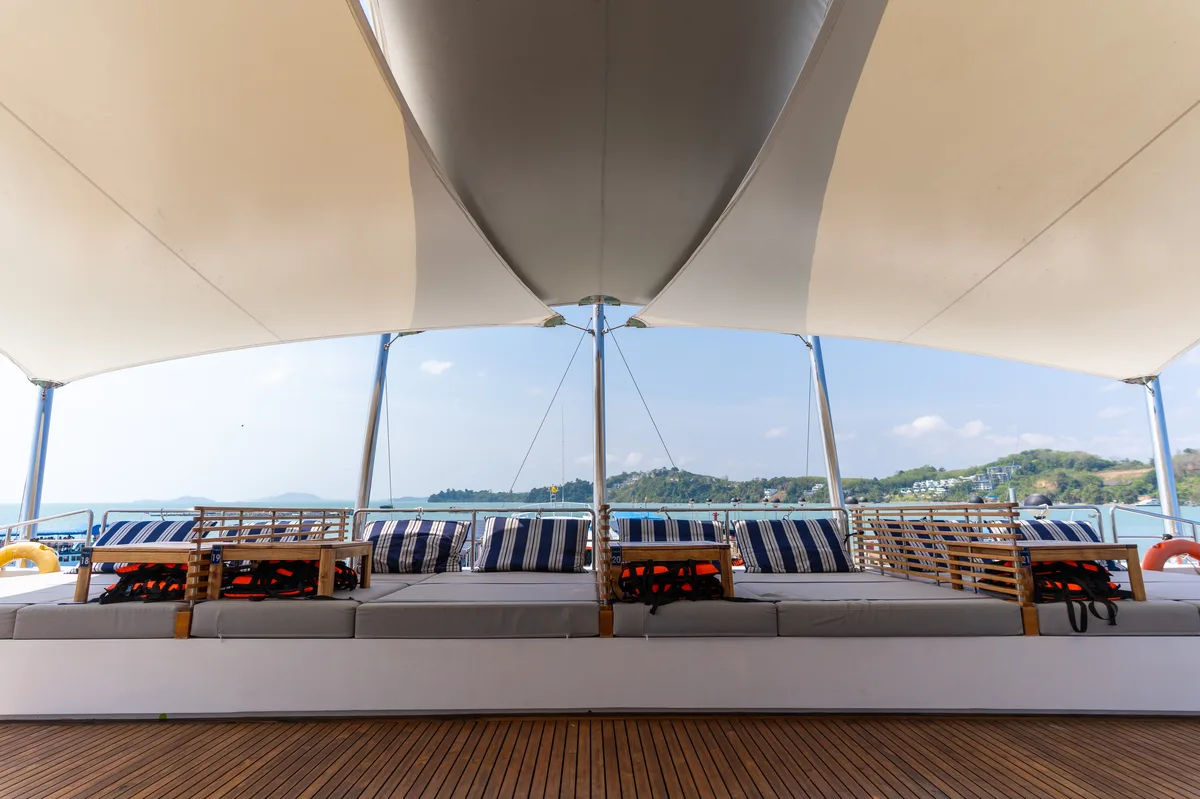 泰国的额外好处是您可以在Dancing Queen上享受这一切,这是一艘112英尺的宽敞大型团体船,专为想要放松而不感到拥挤的团体而设计。忘记那些拥挤的旅游船只,在那里隐私感就像大海捞针;这艘船在这些水域中运行良好,给您舒展和沉浸在风景中的空间。